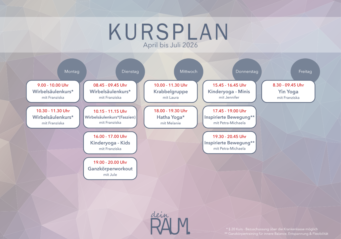 Entdecke unseren aktuellen Kursplan und finde die perfekten Zeiten für dein Training, deine Entspannung und deinen Weg zu mehr Wohlbefinden. Du findest sowohl Kurse von unseren eigenen Kursleitern als auch von externen Anbietern. Für die Kurse unserer eigenen Kursleiter kannst du dich bequem direkt über den Anmeldebutton anmelden.