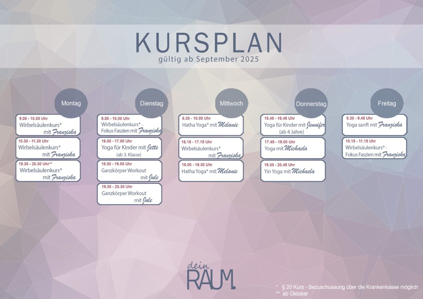 Entdecke unseren aktuellen Kursplan und finde die perfekten Zeiten für dein Training, deine Entspannung und deinen Weg zu mehr Wohlbefinden. Du findest sowohl Kurse von unseren eigenen Kursleitern als auch von externen Anbietern. Für die Kurse unserer eigenen Kursleiter kannst du dich bequem direkt über den Anmeldebutton anmelden.